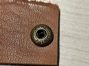 オス側の金具は裏側が平らだったので打ち台の裏側を使いましたが、メス側の金具は丸く作られているので、この丸みを潰さない様に打ち台のちょうど良い凹みを探してそこにはめてカシメます。
